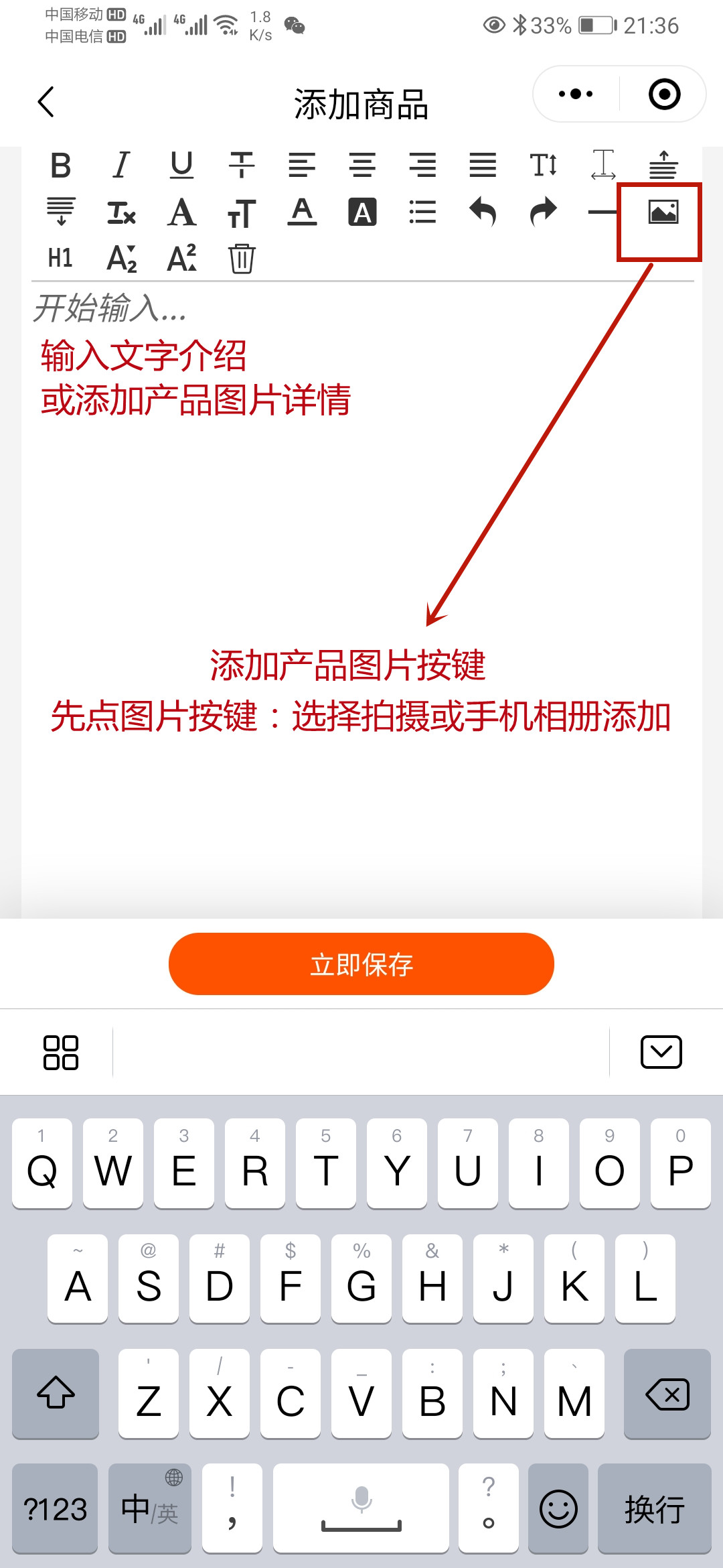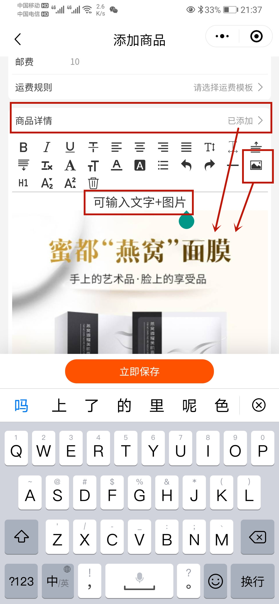 第七步:商品详情--文字编辑可直接输入,选择详情编辑器自由调整与设置,添加图片详情,如下图,点击图片上传图片图标,直接手机拍摄或相册上传。建议上传(宽750*高1280)尺寸图片,图片太大,图片读取慢,影响顾客消费体验。