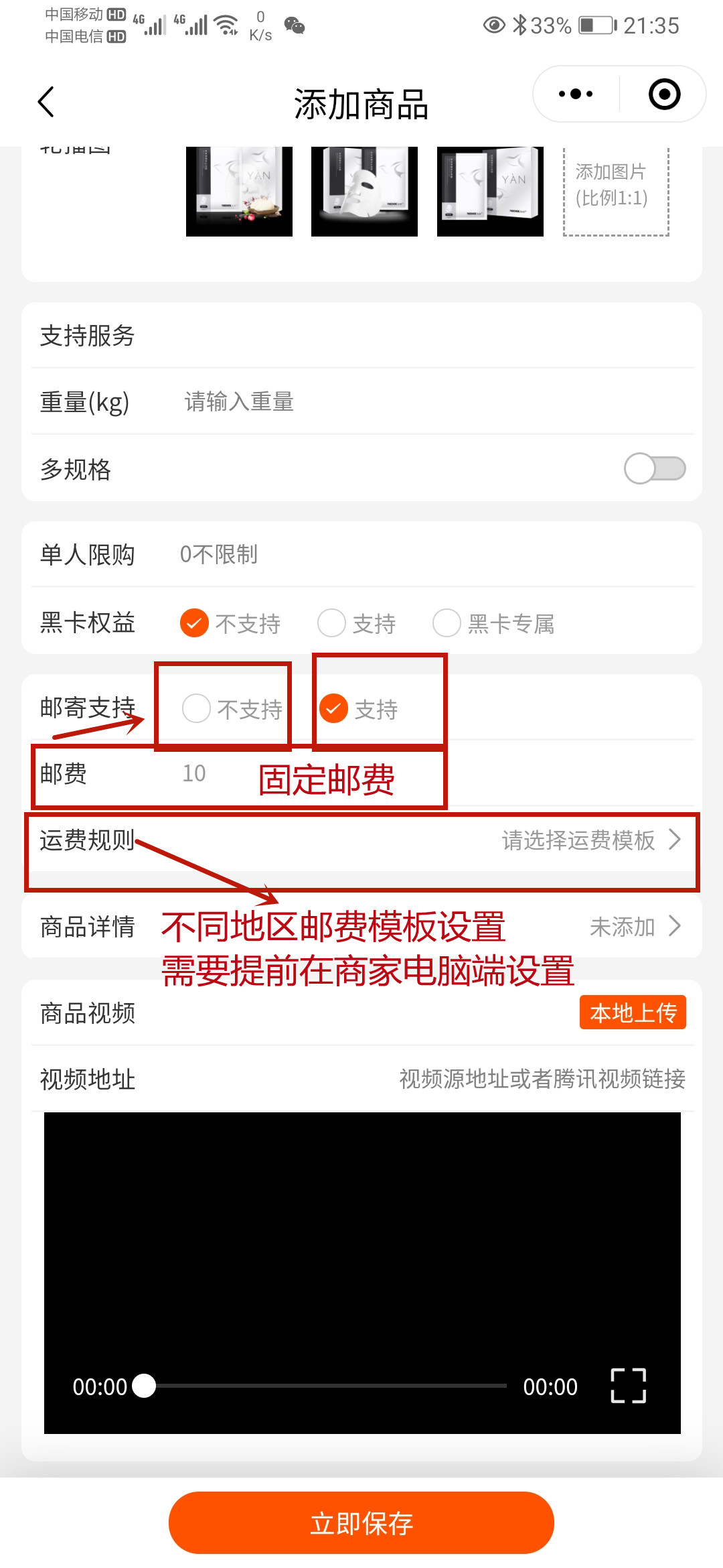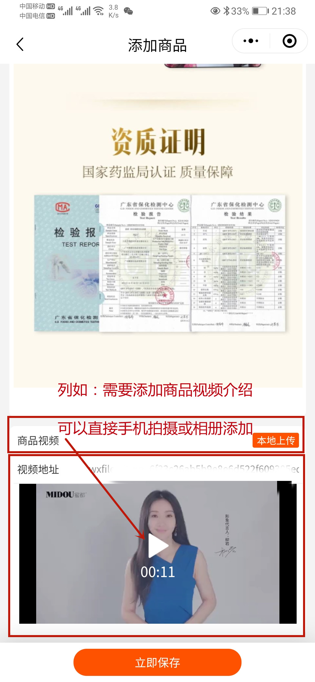 第八步:商品视频,如果需要添加商品视频介绍,本地相册上传添加或手机拍摄上传(建议15秒以内视频,时间过长上传不成功)。如下图
