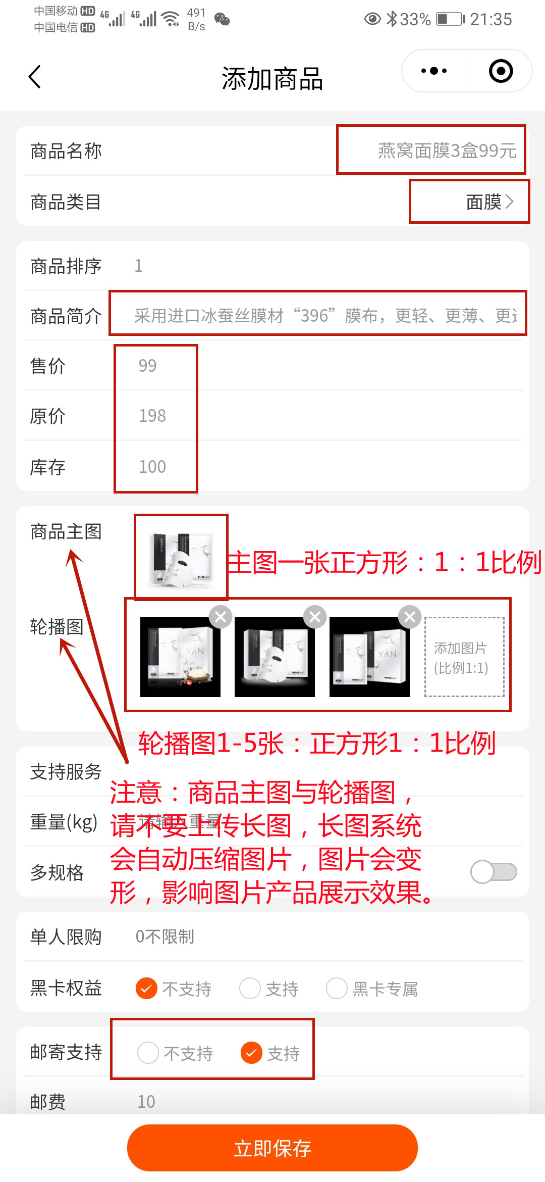 第三步:按步骤填写商品信息:商品名称、商品分类、商品简介、商品价格、商品规格、商品详情等。商品主图与轮播图为1:1比例图片,建议尺寸(高750*宽750像素图片)其他比例图片系统自动压缩,请勿上传其他比例图片,影响产品展示效果。