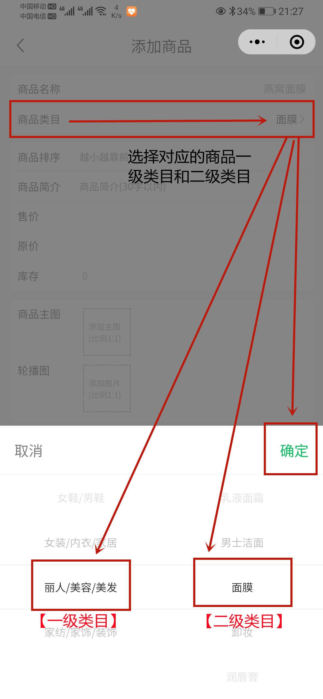 第四步:商品类目,选择需要上架商品的一级分类,再选择商品对应的二级分类,选择好确定添加。